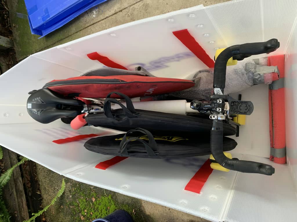 A T58 triangular box packing example – bicycle, three wheels, and personal items.
